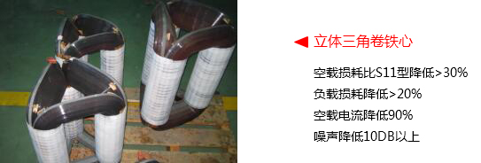 與目前國標的S11型配電變壓器相比,立體卷鐵心一級能效變壓器空載損耗降低30%以上,負載損耗降低20%以上,總損耗降低25%以上。空載電流和噪聲水平均大幅度降低。